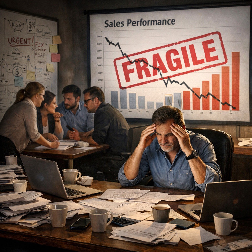 Revenue keeps climbing — but it climbs because of your relationships, your instincts, your hours. The team is good, but the machine doesn't run without you in the room. At some point, you're the limiting factor.